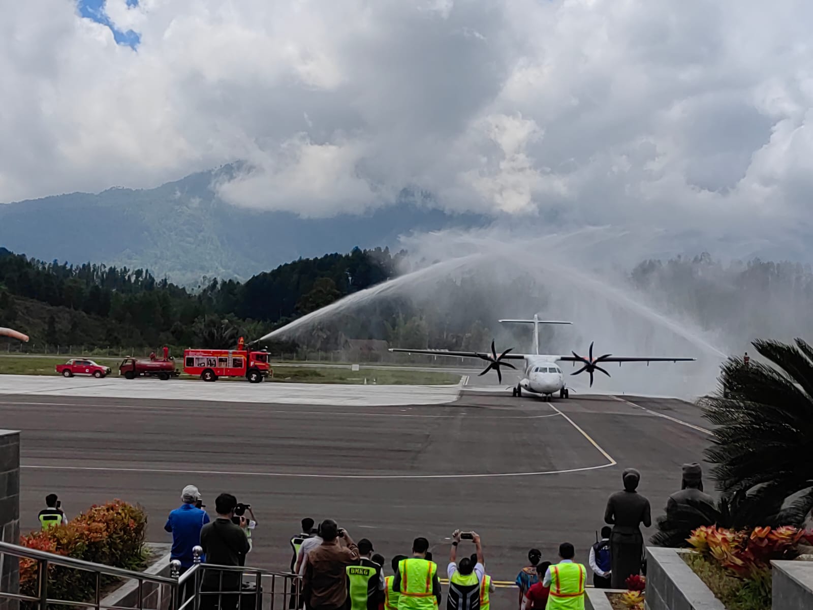 Penerbangan perdana menggunakan pesawat jenis ATR 72-500/600, ditandai dengan guyur ke arah pesawat di apron Bandara Buntu Kunik, Tana Toraja.
