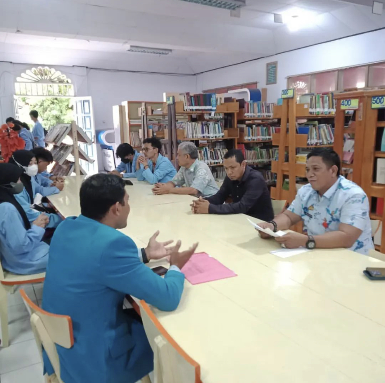 Bersama Tim Layanan Perpustakaan Kota Makassar, Menyambut Kunjungan dari Universitas Islam Makassar (UIM), Program Studi Perpustakaan dan Sains Informatika Fakultas Sastra dan Humaniora (FSH), diketuai Laode Rusadi, ke Perpustakaan Umum di Jalan Lamaddukelleng.