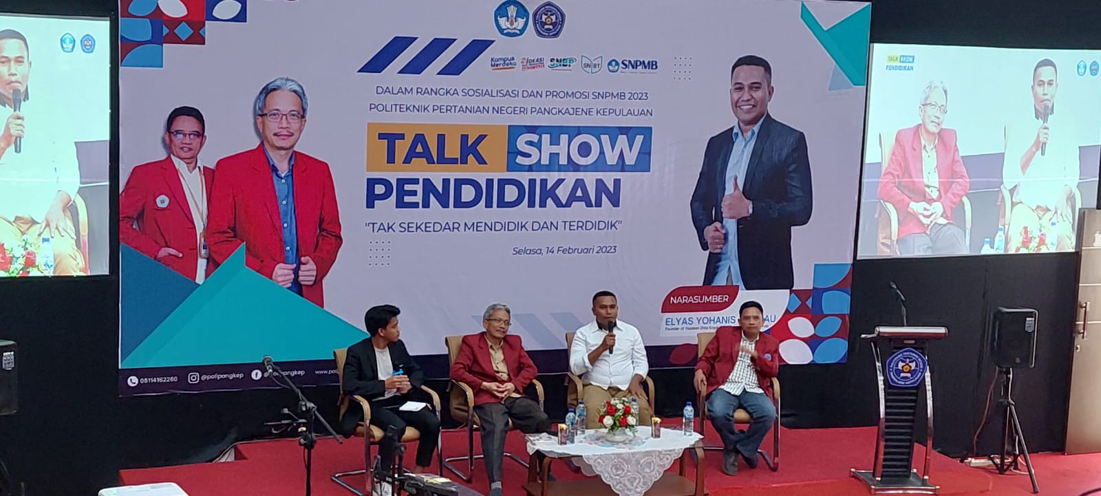 Talkshow Pendidikan yang mengangkat tema: “Tak Sekedar Mendidik dan Terdidik”. Acara ini dilaksanakan secara luring sekaligus ditayangkan secara live stream melalui kanal youtube Polipangkep TV. Narasumber yang hadir adalah Elyas Yohanis Asamau, S.IP., M.P.P. dan dimoderatori oleh Afdhal Faizur Ridho di Gedung New LT kampus Politani Pangkep. Selasa (14/02).