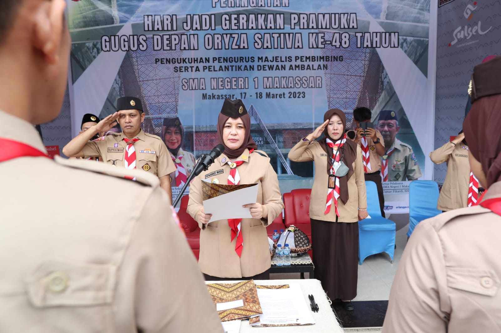 Ketua Kwartir Cabang Kota Makassar, Fatmawati Rusdi, mengukuhkan dan melantik pengurus majelis pembimbing dan pembina ambalan Pramuka Oryza Sativa Gugus Depan 01-29, 01-30, di lapangan SMA Negeri 1 Makassar, Sabtu (18/03/2023).