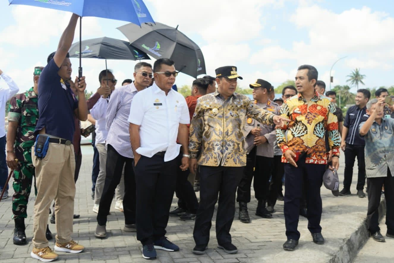 Tampak, Bupati Andi Muchtar Ali Yusuf bersama Forkopimda Bulukumba dan sejumlah Kepala organisasi perangkat daerah (OPD), mendampingi Pj Gubernur ke PPI Bonto Bahari untuk menyerahkan secara simbolis Bantuan Kapal Perikanan.