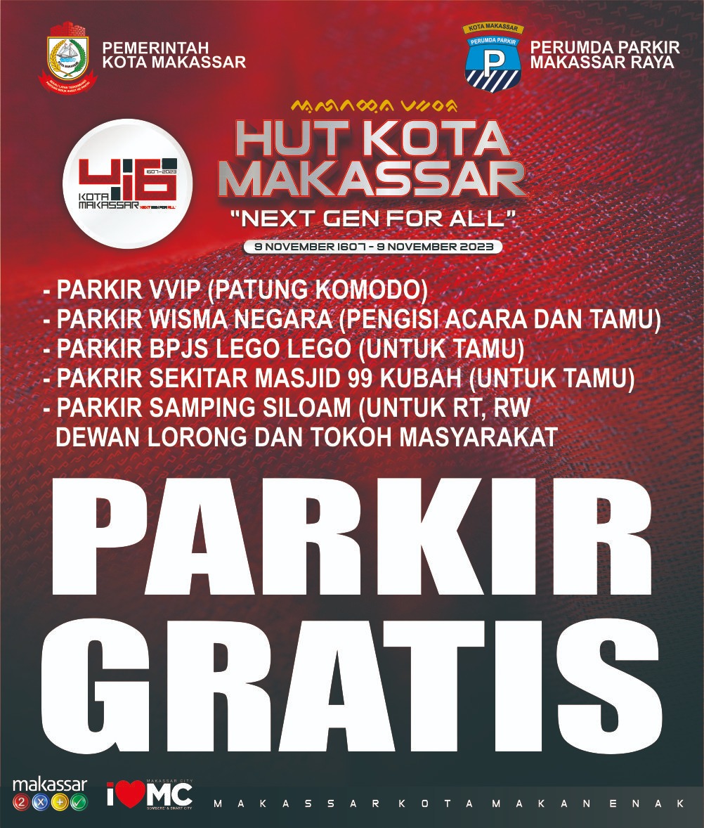 klikkiri.co – PD Parkir Makassar Raya menyiapkan lima kantong parkir gratis bagi masyarakat dan tamu yang akan menyaksikan puncak Peringatan HUT Kota Makassar ke-416, Kamis (2/11/2023).