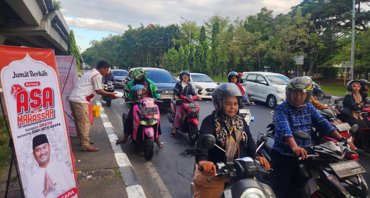 Kegiatan Jumat Berkah Nasi Kuning Gratis Bersama Andi Seto Asapa (ASA) ini berlangsung di sekitaran Fly Over, Makassar, pada Jumat (12/7/2024) pagi.