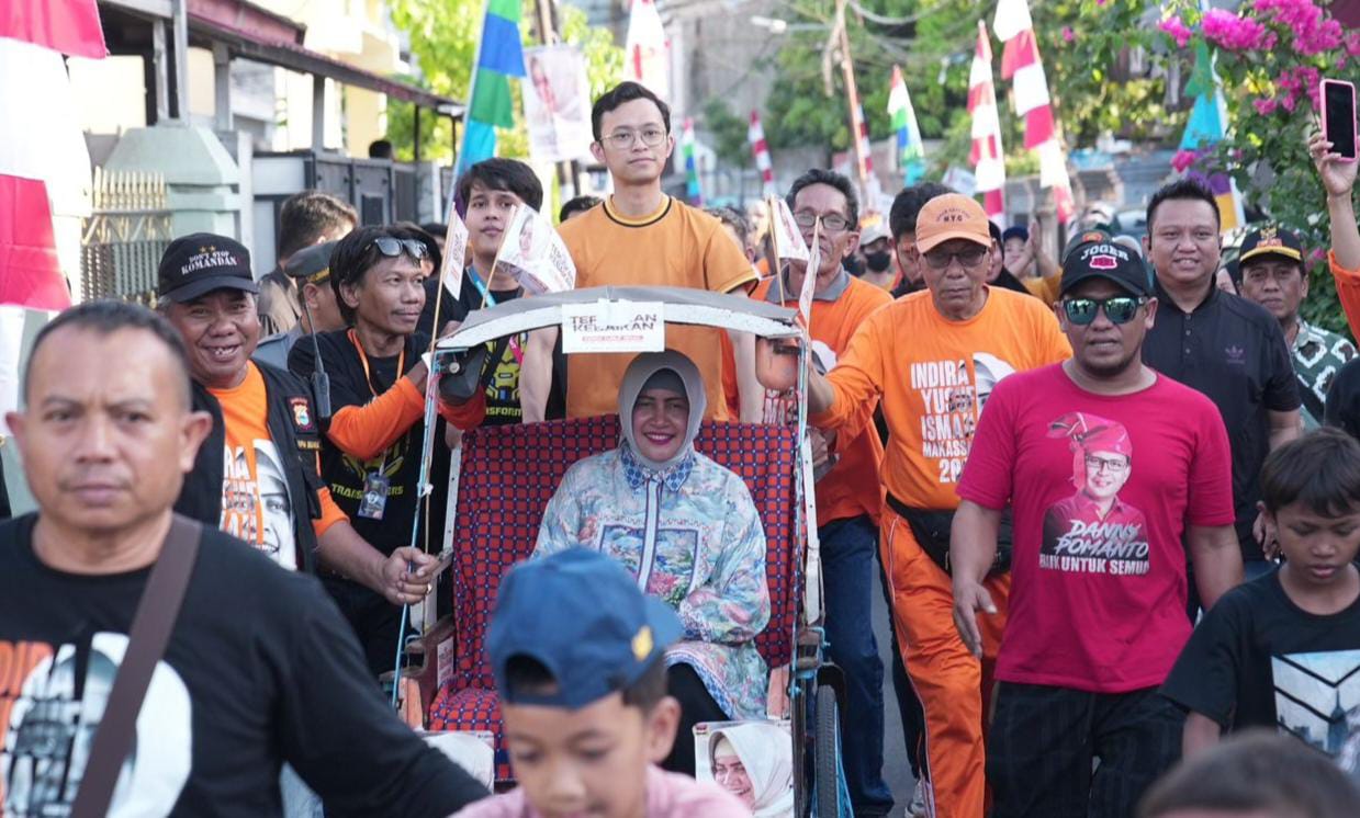 Ilham Ari Fauzi Kayuh becak dan Indira jadi penumpangnya, didampingi banyak timnya. (*)