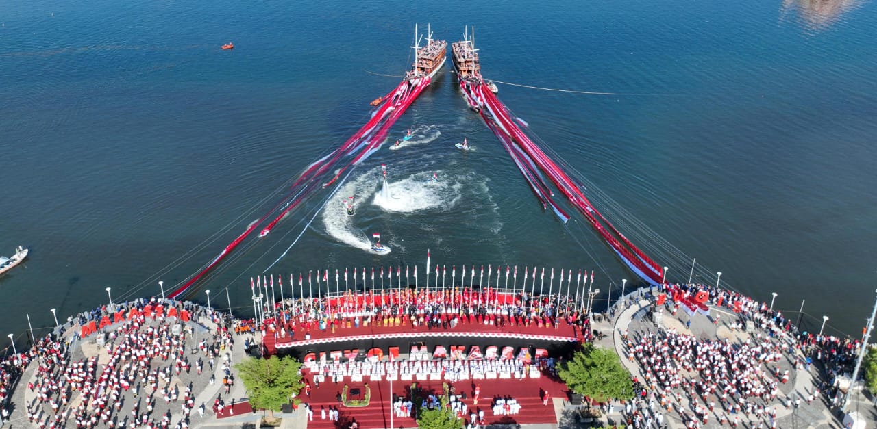 Bentangan 7.900 meter bendera merah putih di atas permukaan laut Makassar hingga ke sisi Anjungan Bugis dan Anjungan Makassar tersebut menyemarakkan perayaan hari kemerdekaan.