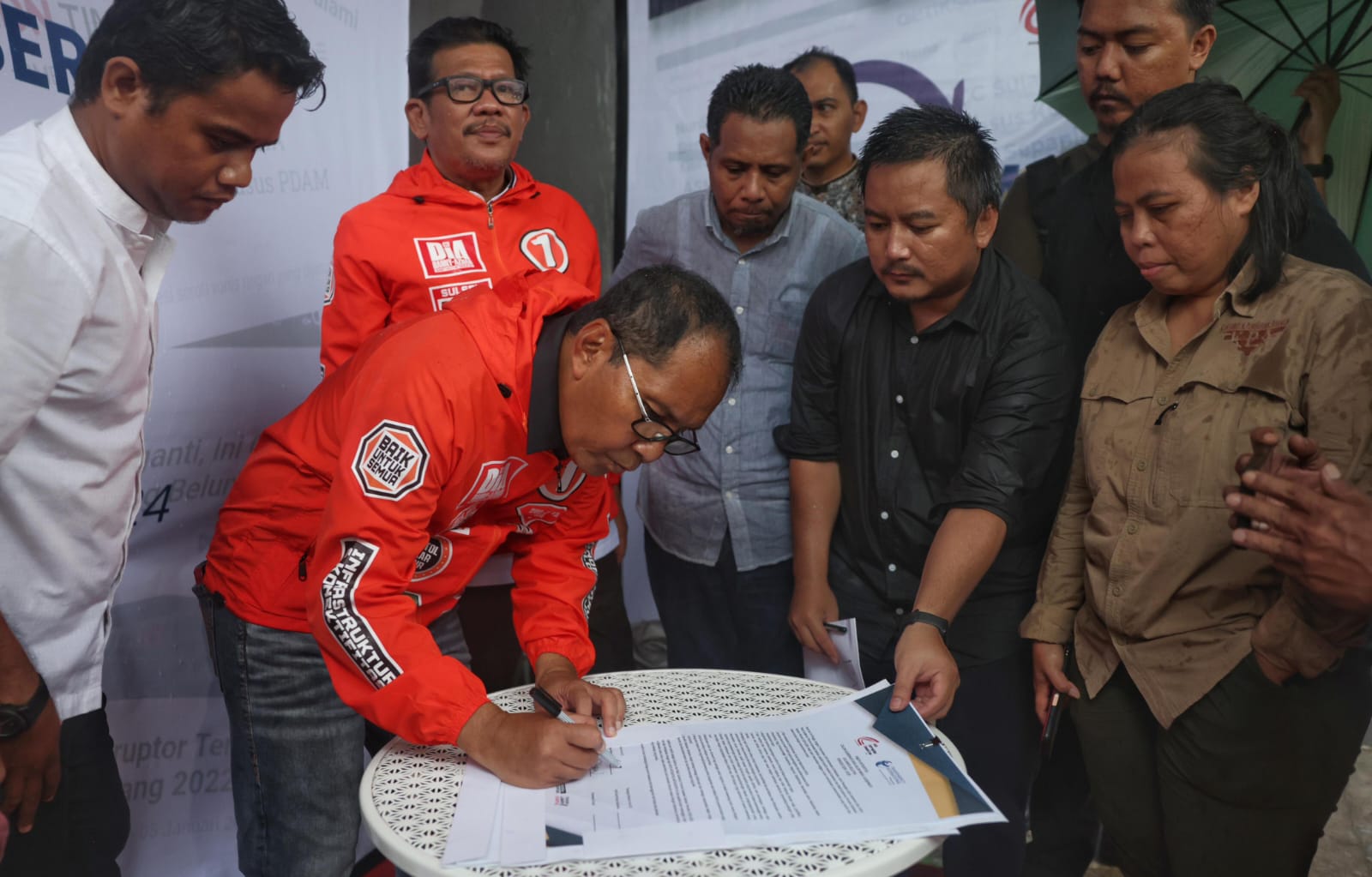 Disaat acara masih berlangsung, cuaca berubah menjadi hujan disertai angin kencang. Meski demikian, tak membuat acara penandatanganan terhenti.