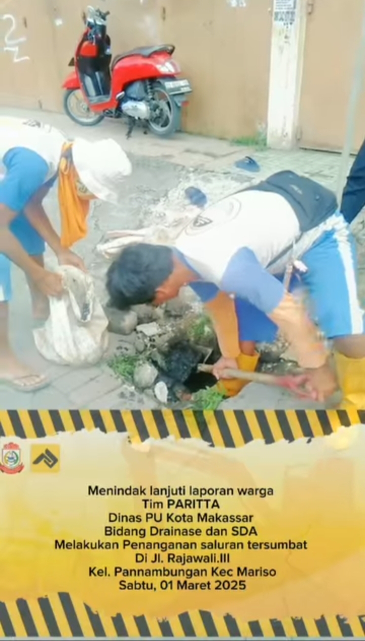 klikkiri.co – Sebagai respons atas laporan warga terkait tersumbatnya saluran drainase, Tim PARITTA dari Bidang Drainase dan Sumber Daya Air (SDA) Dinas Pekerjaan Umum (PU) Kota Makassar melakukan penanganan di lokasi yang terdampak, tepatnya di Jl. Rajawali III, Kelurahan Pannambungan, Kecamatan Mariso, pada Sabtu, 1 Maret 2025.