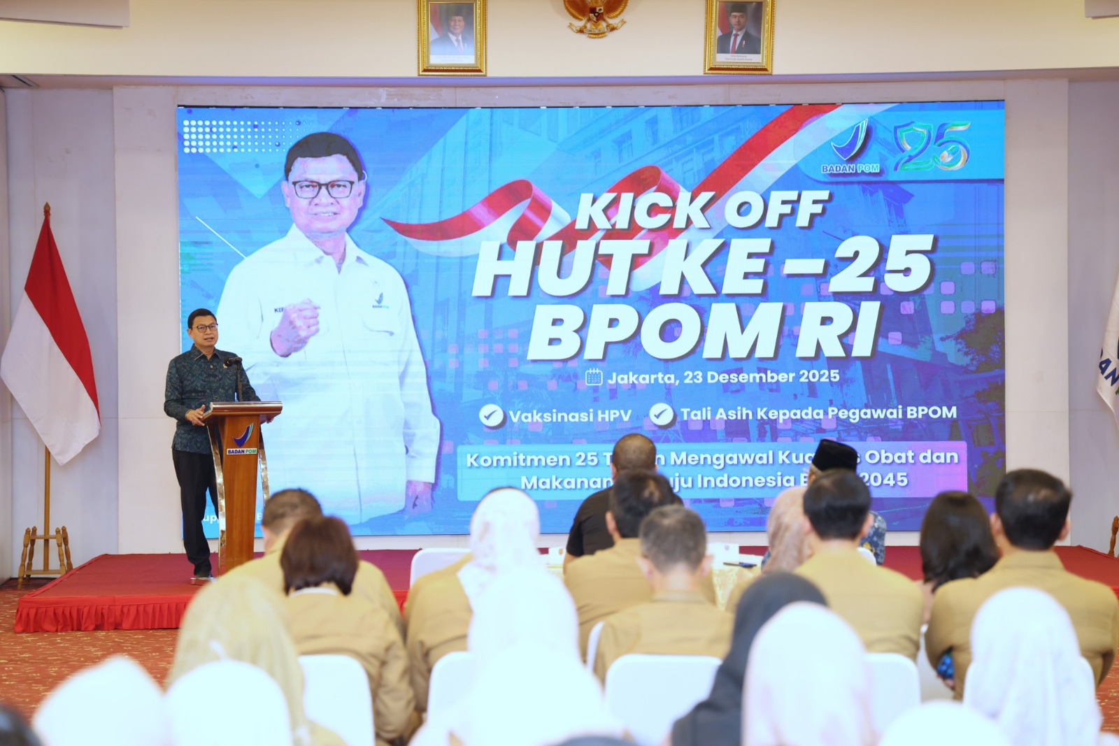 Kick off HUT BPOM ke-25 ditandai dengan dua pesan utama, perlindungan perempuan melalui dukungan vaksin kanker rahim (HPV) dan penghormatan terhadap para pekerja BPOM yang bekerja dalam senyap.