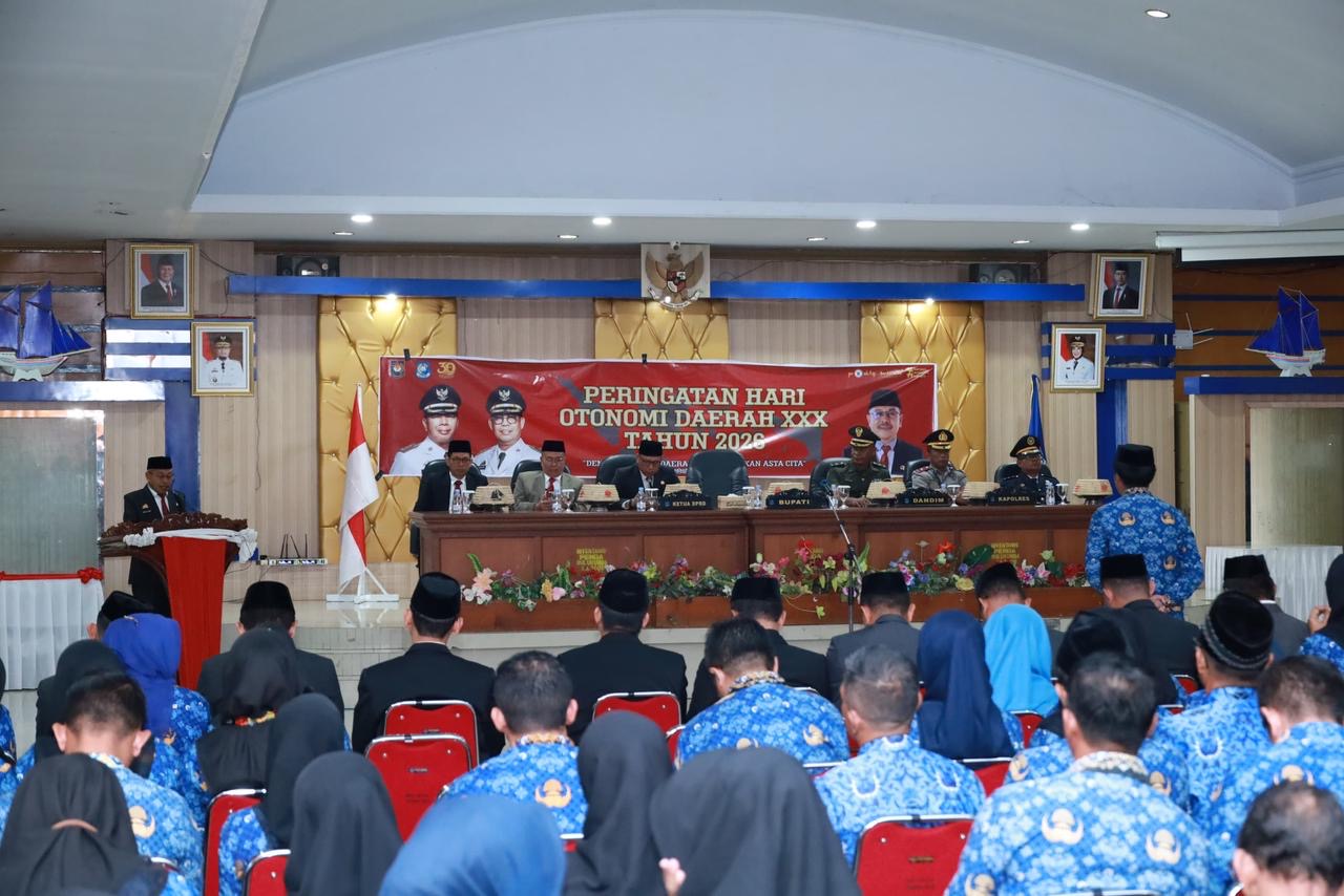 Dalam kesempatan tersebut, Sekretaris Daerah membacakan sambutan seragam Menteri Dalam Negeri Muhammad Tito Karnavian dalam rangka Peringatan Hari Otonomi Daerah ke-XXX Tahun 2026. Dalam sambutannya, Mendagri menyampaikan apresiasi kepada seluruh jajaran pemerintah daerah, tokoh masyarakat, akademisi, insan pers, serta seluruh elemen bangsa yang telah berkontribusi dalam menyukseskan pelaksanaan otonomi daerah di Indonesia.